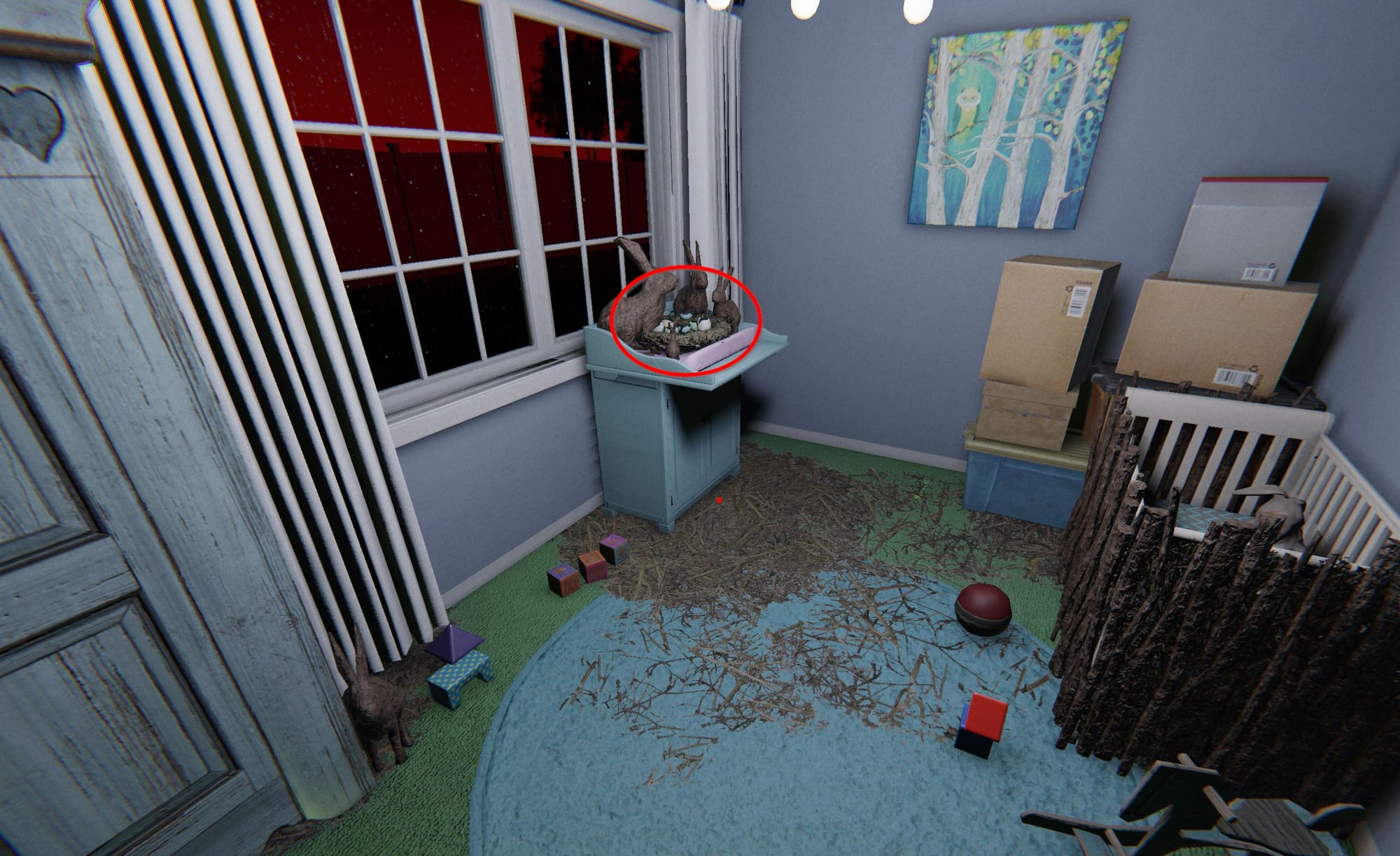 In the bedroom and the rooms therein, the storage room and the bathroom you will find a total of 4 nests of the servants of the forest.